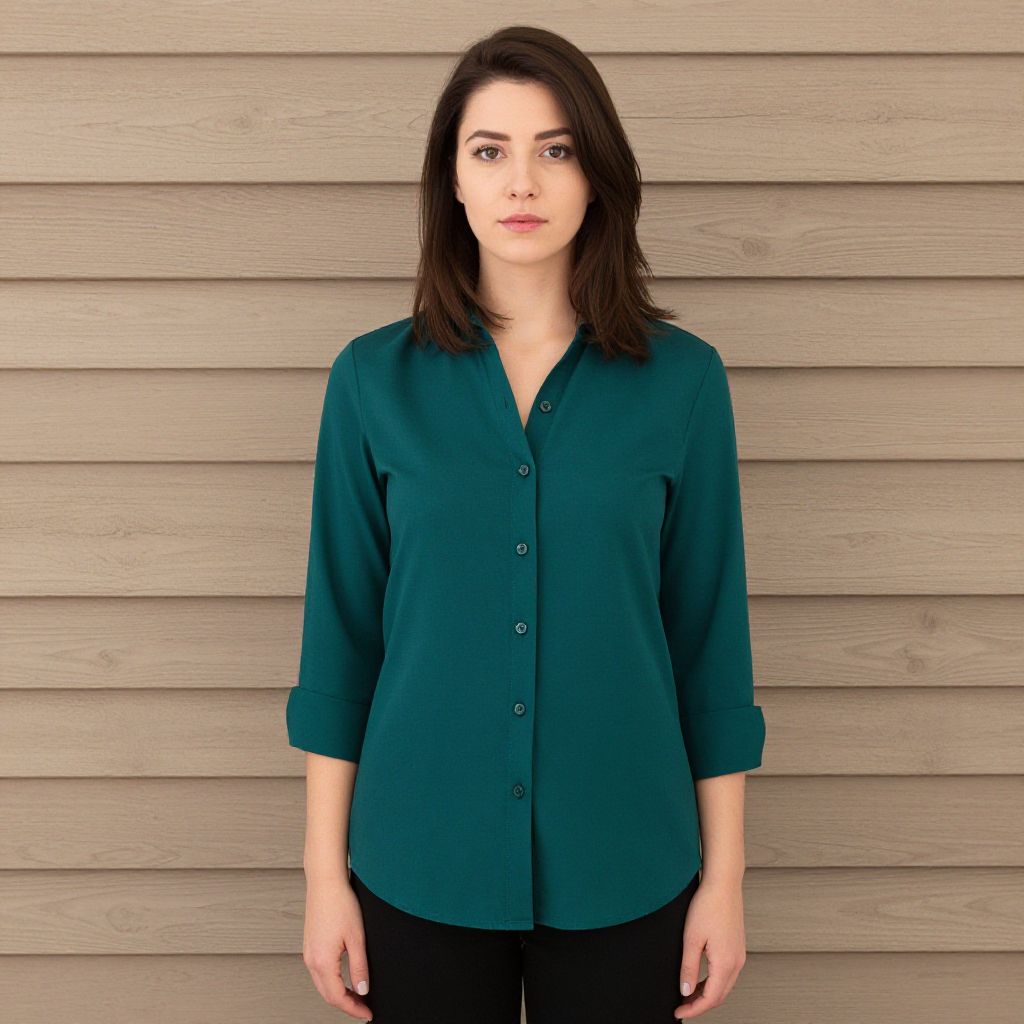 Photograph of a woman standing against a light brown, horizontally-paneled wooden wall. She has fair skin, dark brown shoulder-length hair, and is wearing a teal, button-up blouse with rolled-up sleeves, paired with black pants. Her expression is neutral, and she is looking directly at the camera. The lighting is even, highlighting the textures of her blouse and the wooden wall behind her. The image has a clean, professional look, with no additional objects or distractions in the background.