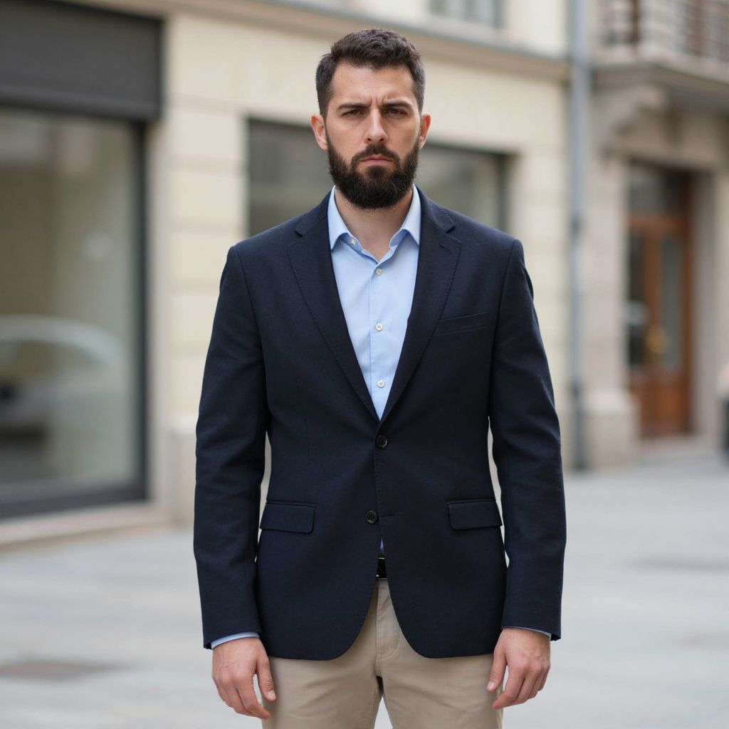 Photograph of a bearded man with short dark hair standing against a graffiti-covered wall. He's wearing a light blue dress shirt, bright red pants, and black shoes, with a bold yellow jacket that he's holding open. The wall behind him has orange and red graffiti, and he's standing on a gray sidewalk. His confident stance and stylish outfit make a striking contrast.