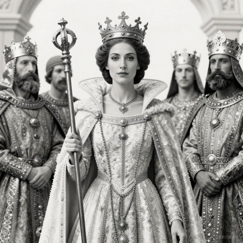 Realistic photo.Black-and-white ink drawing of a noble queen with a crown, holding a scepter, surrounded by loyal subjects, traditional fantasy illustration. realistic photo