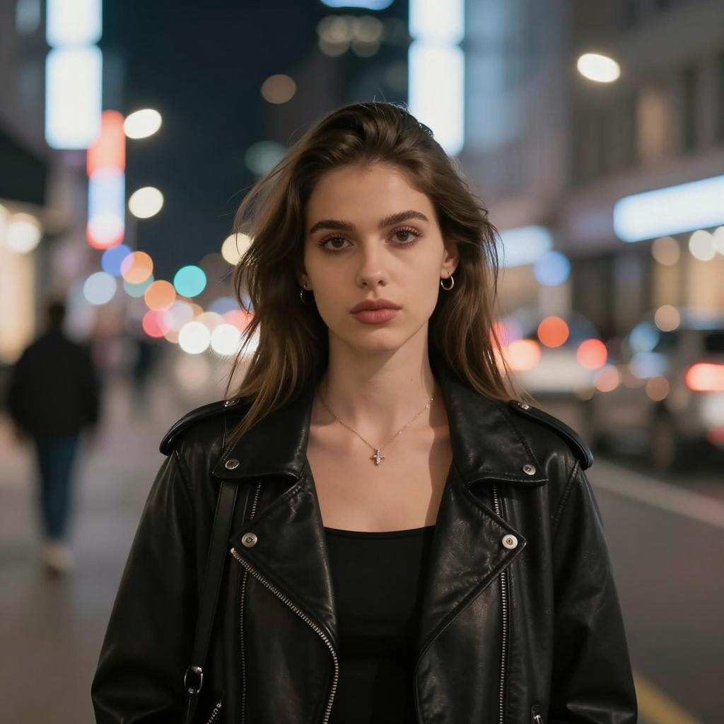 Portrait of a young woman with long brown hair and brown eyes wearing a red jacket and black turtleneck sweater. She has red lipstick and dark nail polish, posing outdoors on a street with a blurred background featuring cars and autumn trees.
