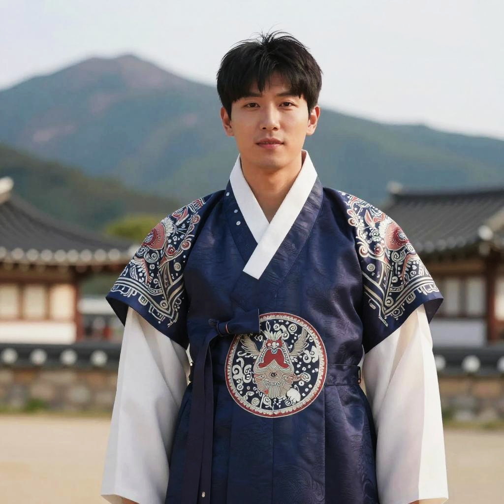 Handsome man in Korean traditional hanbok, standing confidently against scenic mountains, soft natural lighting, detailed intricate patterns, cinematic portrait style