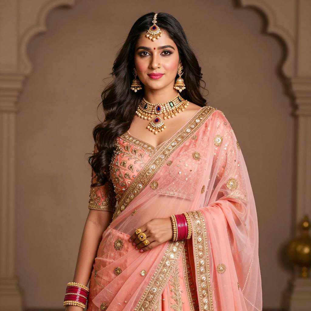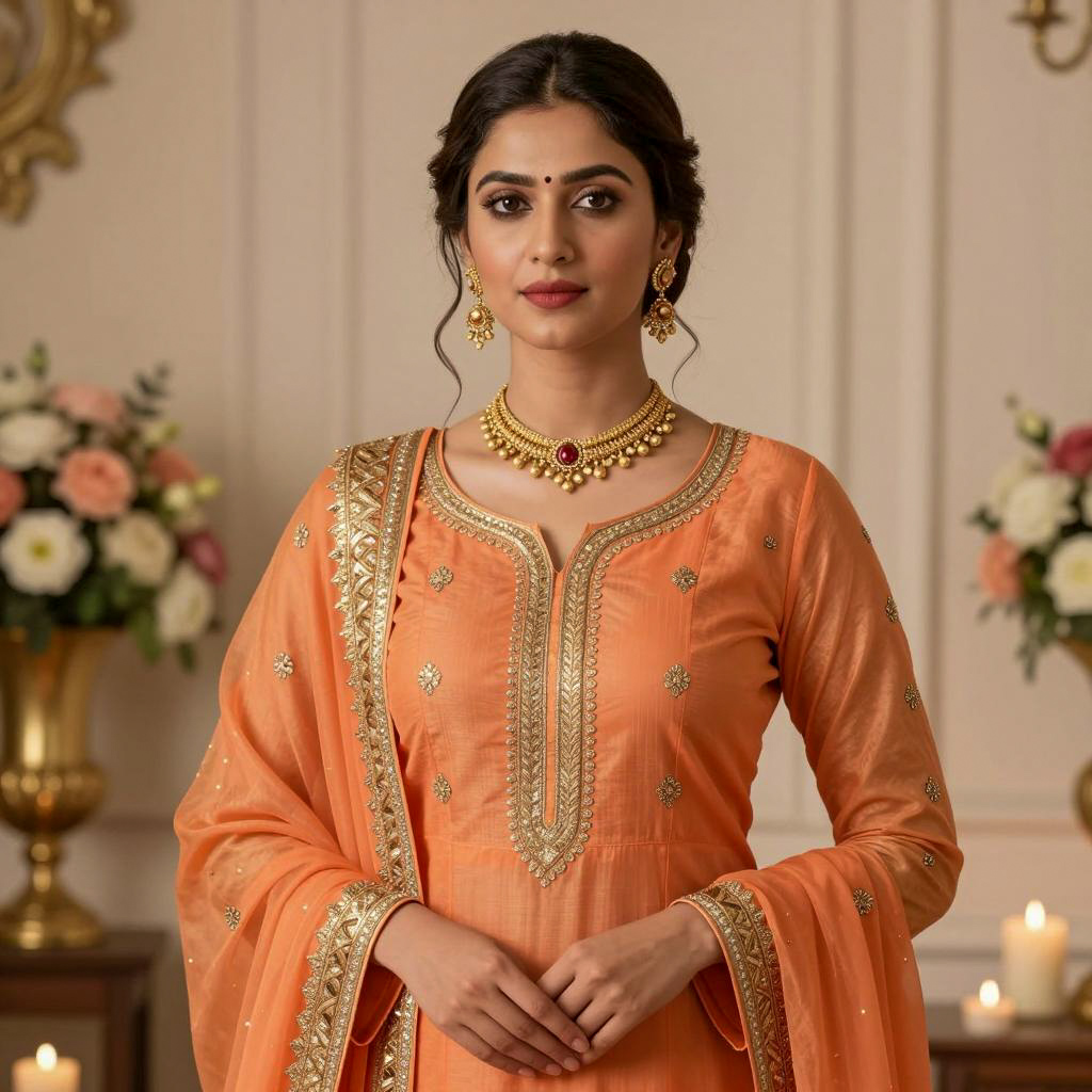 Party wear sharara woman, photograph of an Indian woman, standing indoors, wearing an orange traditional salwar kameez with gold embroidery, gold necklace, earrings, dark hair in a bun, light skin, makeup with red lipstick, background with floral arrangements, candles, blurred vertical striped wallpaper, elegant setting, daytime, soft light, realistic style, detailed ures, warm colors, traditional attire, poised expression