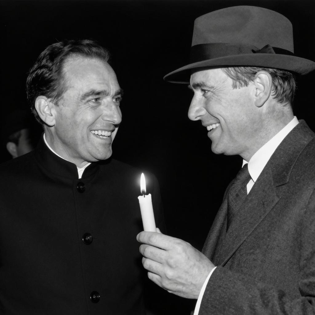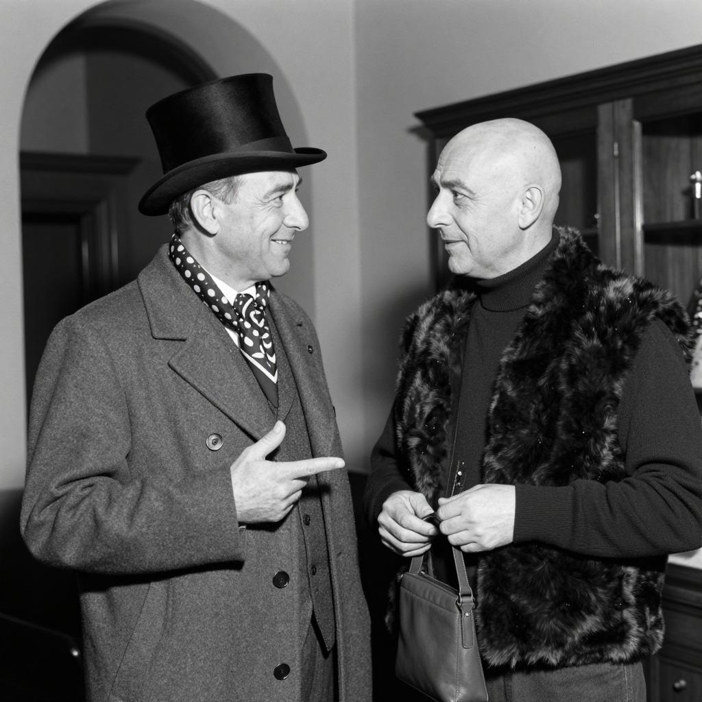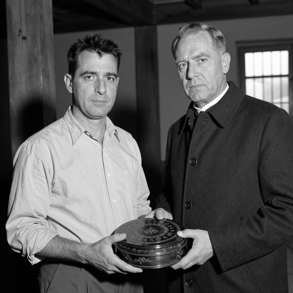 Black-and-white photograph of two men standing indoors. The man on the left has short, dark hair, wearing a light-colored shirt with rolled-up sleeves, holding a circular, ornate wooden box. The man on the right has short, light-colored hair, wearing a dark coat, standing with hands on the box. Wooden beams and a window with bars are in the background. Both men have serious expressions.