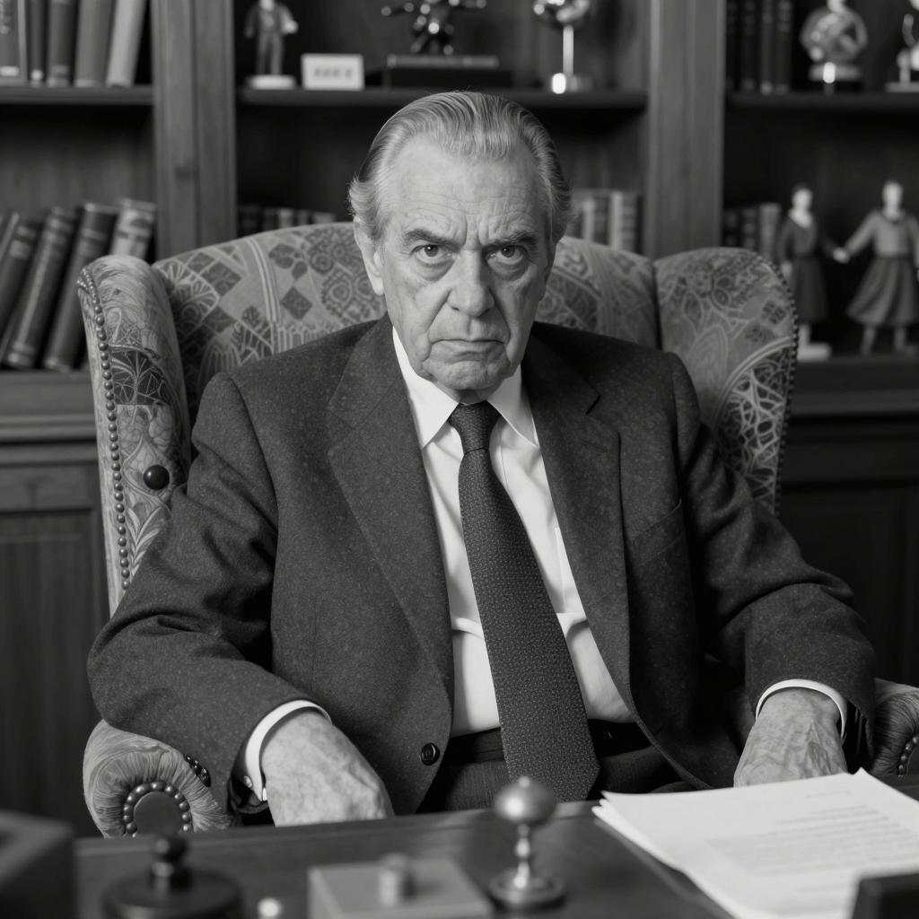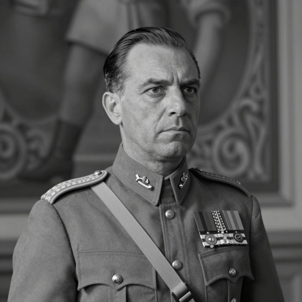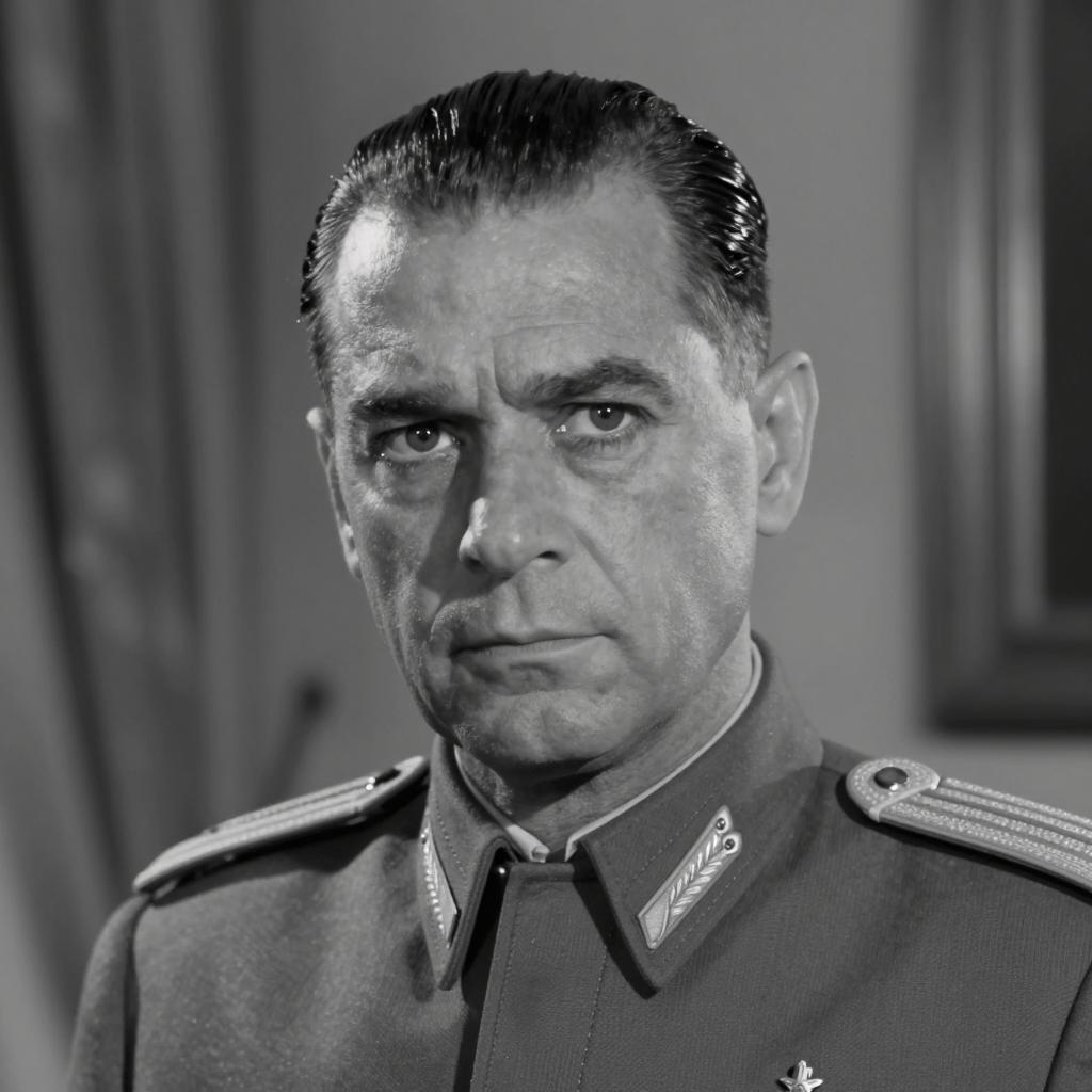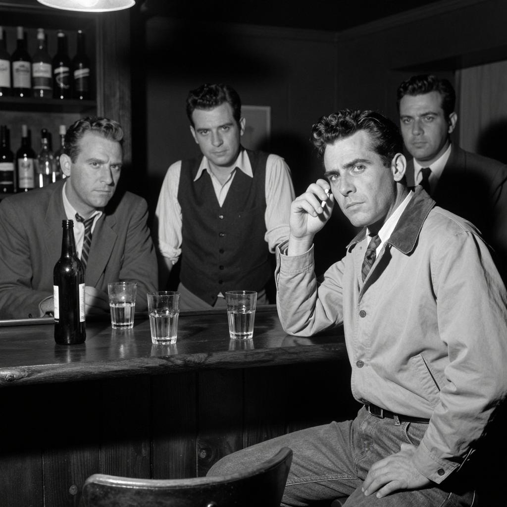 Black-and-white photograph of two men standing indoors. The man on the left has short, dark hair, wearing a light-colored shirt with rolled-up sleeves, holding a circular, ornate wooden box. The man on the right has short, light-colored hair, wearing a dark coat, standing with hands on the box. Wooden beams and a window with bars are in the background. Both men have serious expressions.