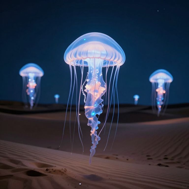 Glowing, ethereal jellyfish-like entities float serenely above a vast desert landscape, their luminous domes casting an otherworldly glow over the undulating sand dunes below.