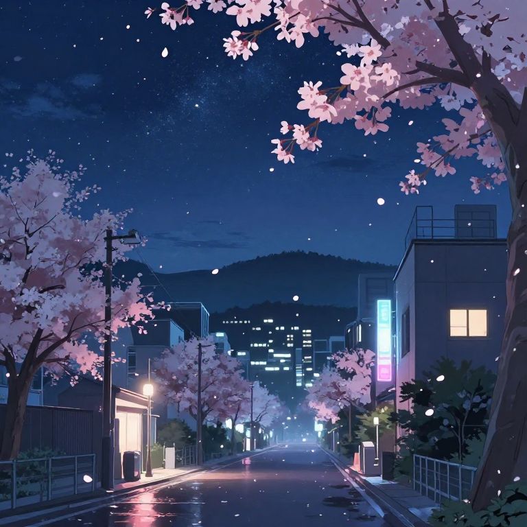 Night background anime scene with a serene starry sky above a quiet cityscape, neon lights reflecting softly on wet streets, gentle breeze rustling cherry blossom petals, mood lighting creating a calm and magical atmosphere, detailed and vibrant colors.
