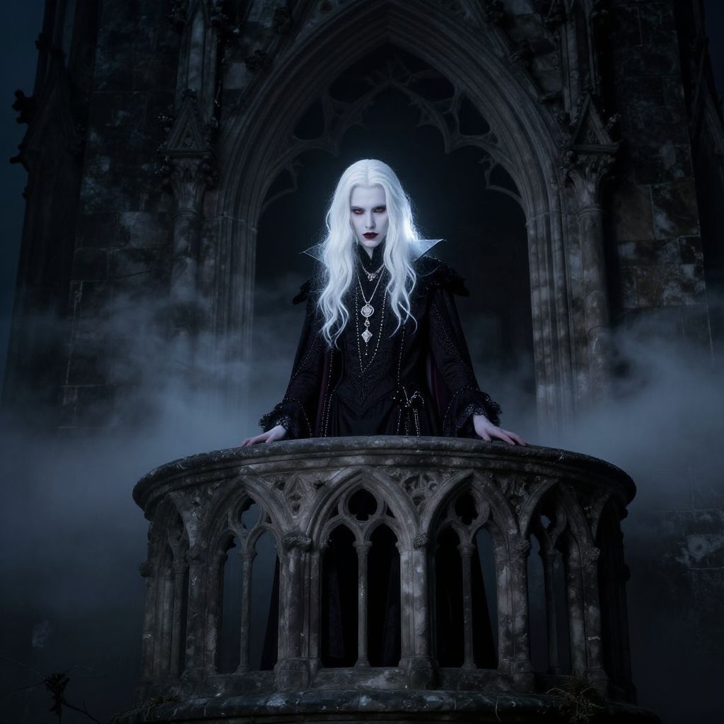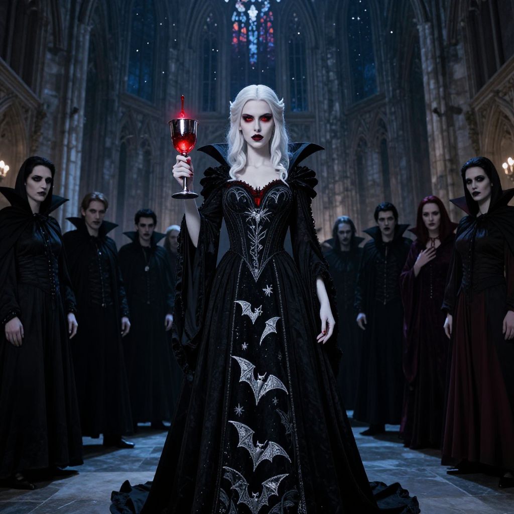 Goddess of vampires depicted as a regal woman with alabaster skin and piercing red eyes, wearing a long black gown embroidered with silver bats, holding a chalice of glowing blood, surrounded by a horde of loyal vampire followers in a ruined cathedral under a starry sky.