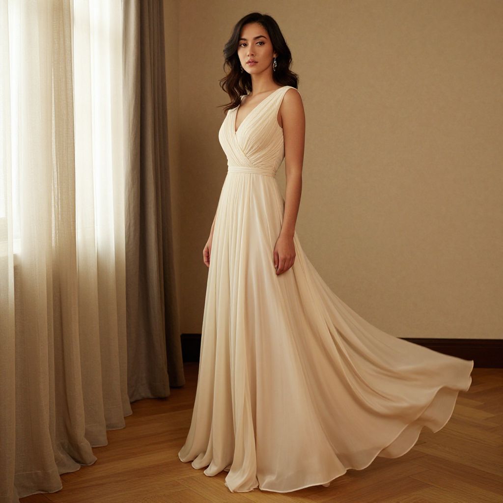 Photograph of a young woman with medium brown skin and wavy, dark brown hair standing in a softly lit room. She is wearing a sleeveless, ivory, floor-length gown with a V-neck and a flowing, pleated skirt that gently drapes to the floor. The gown has a subtle sheen, adding elegance to her appearance. She stands near a window with sheer white curtains and darker, floor-length curtains to the left. The wooden floor and beige walls create a warm, neutral backdrop. The woman's expression is calm and composed, and she is looking slightly to the right.