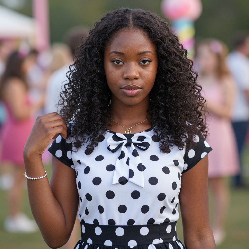 Photograph of a young Black woman with curly hair, wearing a white polka dot dress with black bow, standing outdoors with blurred background of people and
