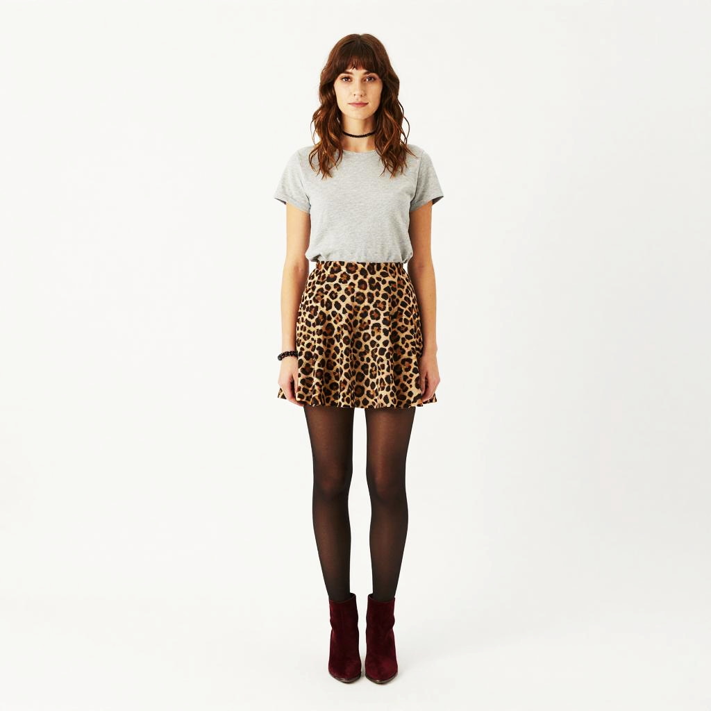 Photograph of a young woman with medium-length, wavy brown hair standing against a plain white background. She's wearing a light gray, short-sleeved t-shirt, a leopard print skirt that's slightly flared, black opaque tights, and burgundy ankle boots with a small heel. She accessorizes with a black choker necklace and a bracelet on her right wrist. Her expression is neutral, and she's standing with a relaxed posture.