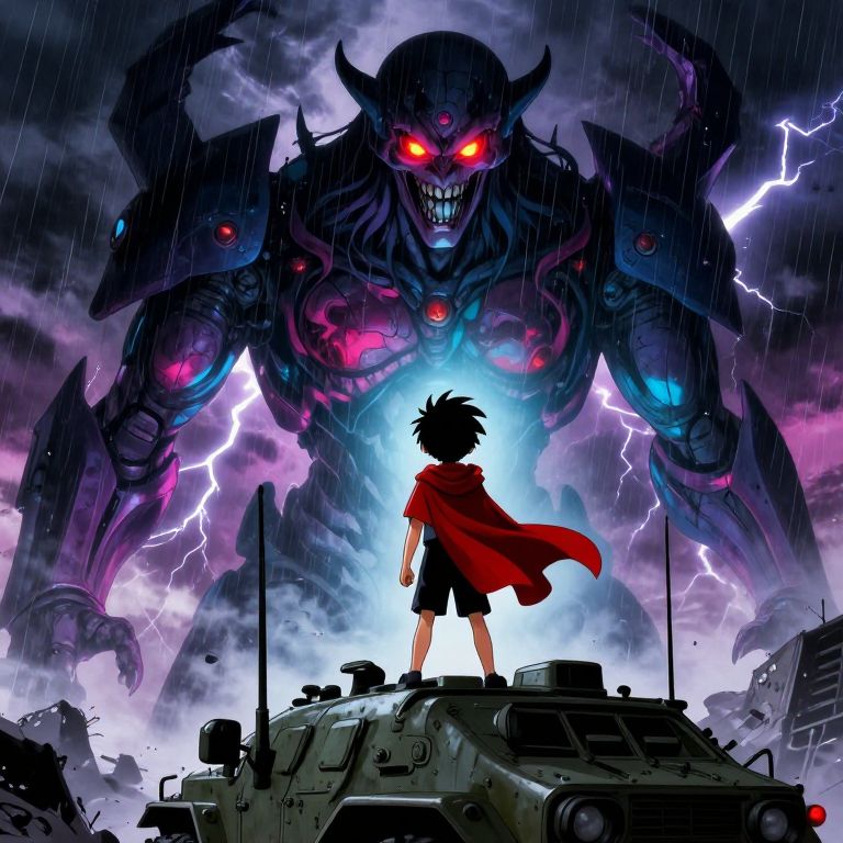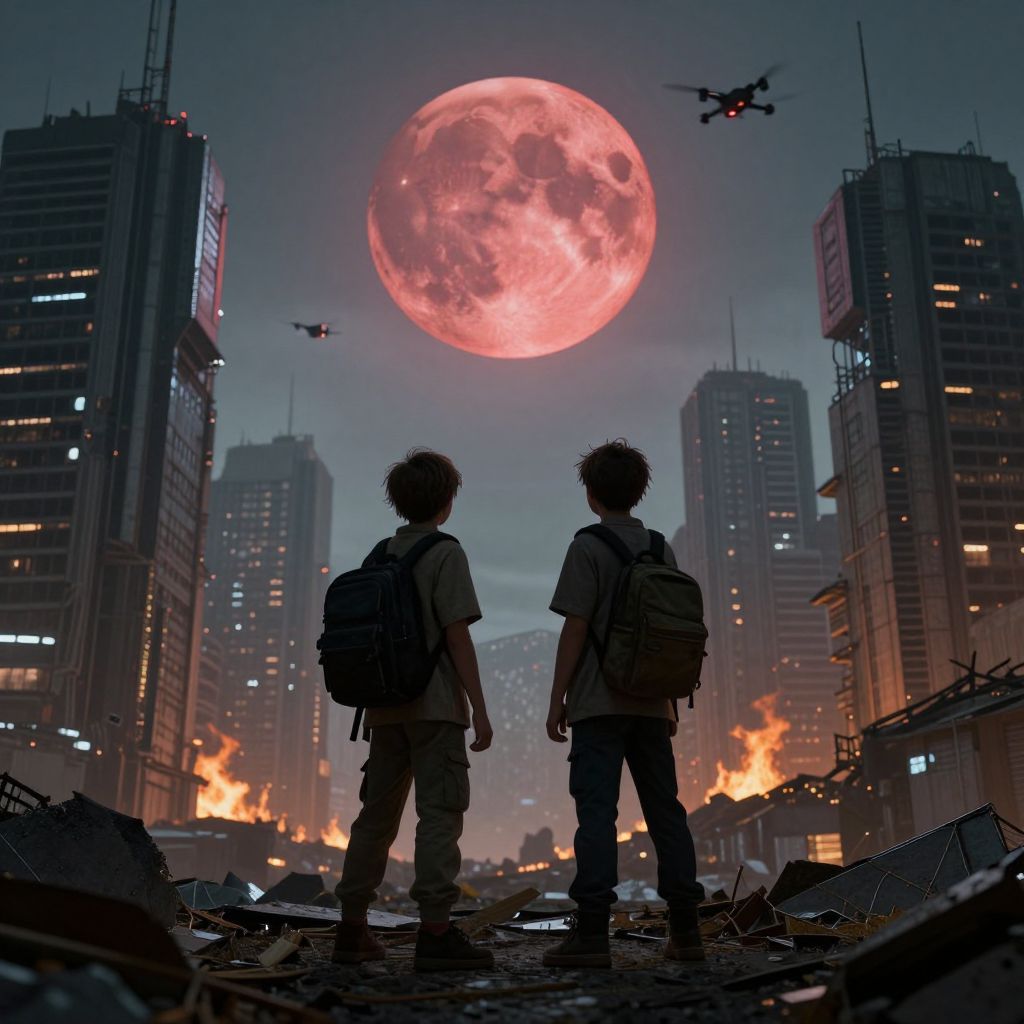 In a dystopian, cyberpunk landscape, two children stand in awe of a towering, dilapidated skyscraper bathed in a fiery red glow. The sky is a smoky, ominous red, casting a gloomy atmosphere over the scene. The children, dressed in red jackets, are positioned in the foreground, their figures silhouetted against the fiery backdrop. Above them, drones fly overhead, adding to the sense of surveillance and control. The scene is illuminated by a warm, muted light, reminiscent of the style of Bernie Wrightson and Frank Frazetta. The tall city towers, with their cracked and broken facades, loom in the background, their structures a testament to a bygone era. Piles of bones and debris litter the ground, hinting at a recent conflict or disaster. The overall composition is dramatic and dynamic, with the children positioned in the center, drawing the viewer's attention to their contemplation of the towering structure. The interplay of colors, textures, and shapes creates a sense of depth and complexity, making the scene both visually rich and structurally compelling.