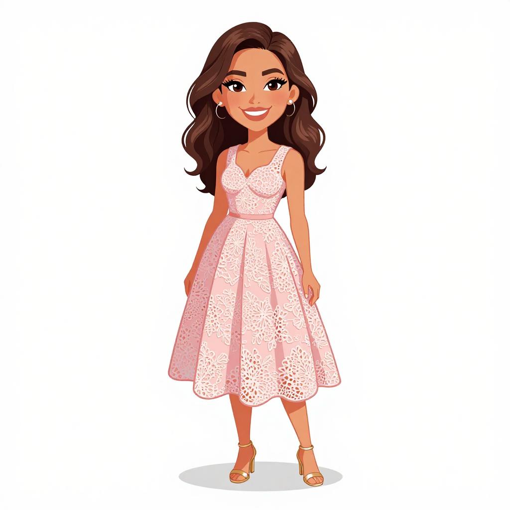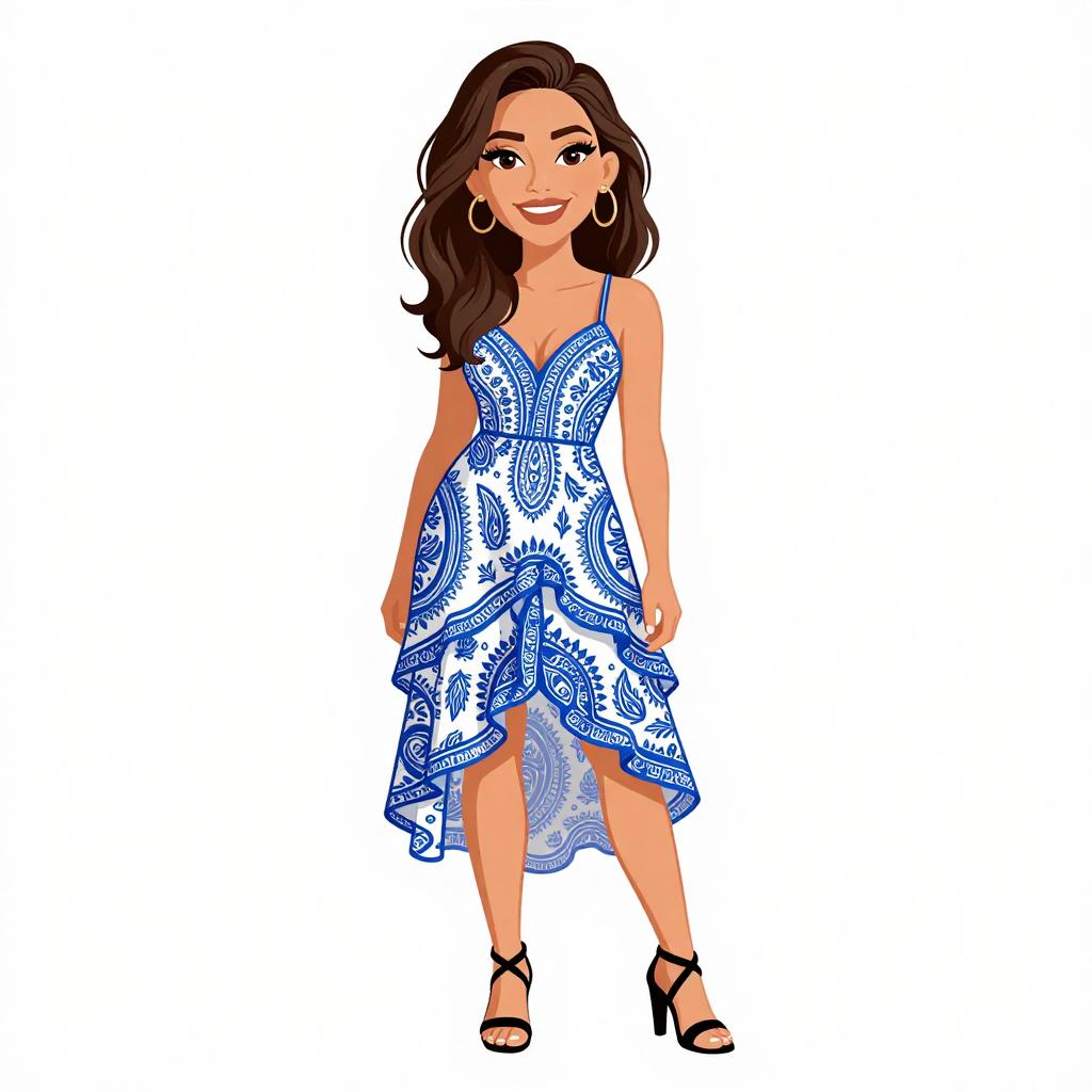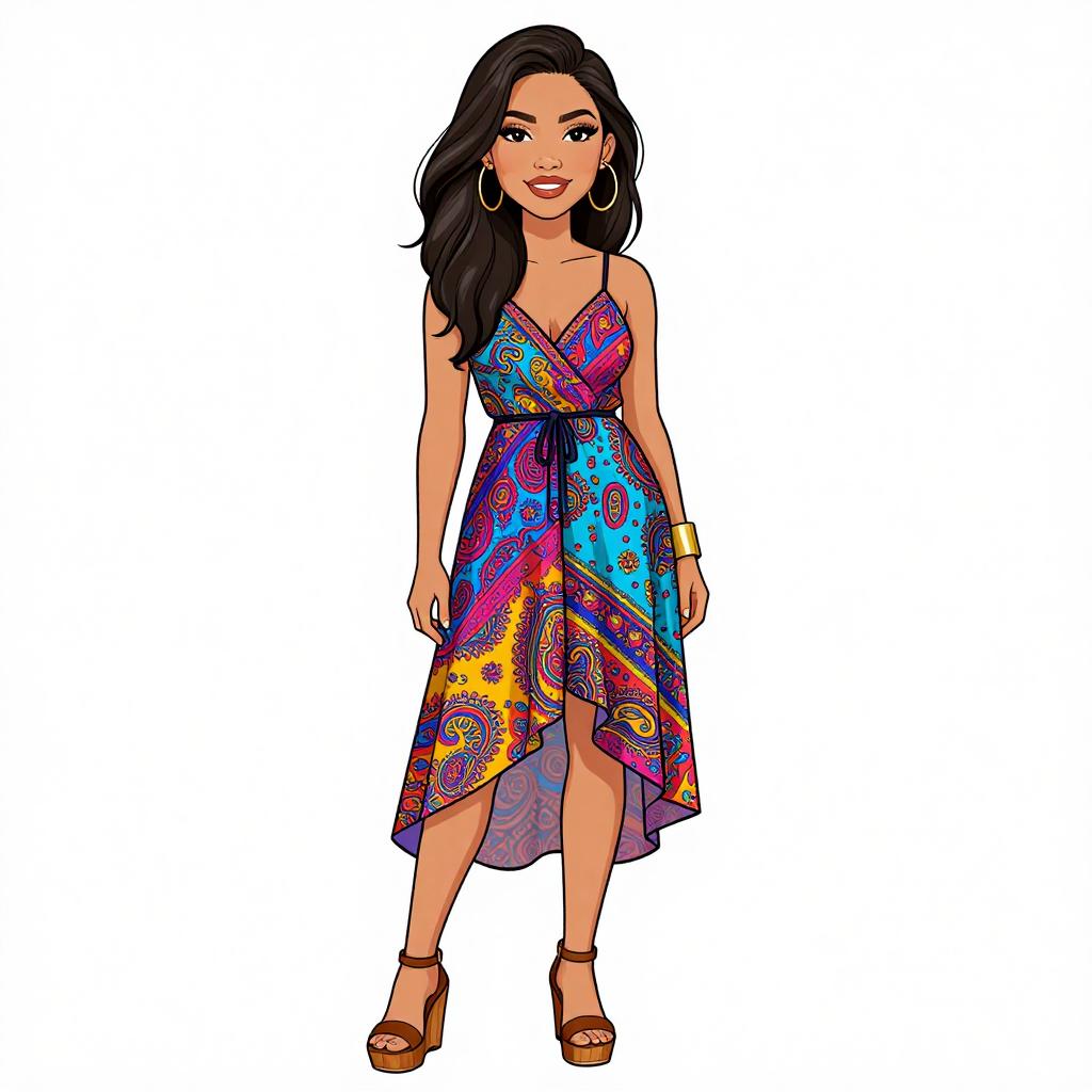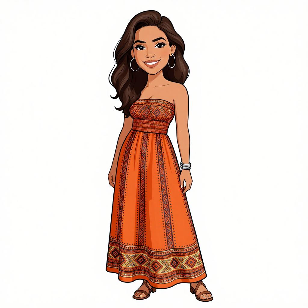 Woman with pretty face and pretty hair. smiling Woman, bohemian, strapless maxi dress in vibrant orange with ethnic-inspired patterns, smocked bodice, empire waistline, full-length flowing skirt, flat brown strappy sandals, silver bangle on wrist. --sref 1467