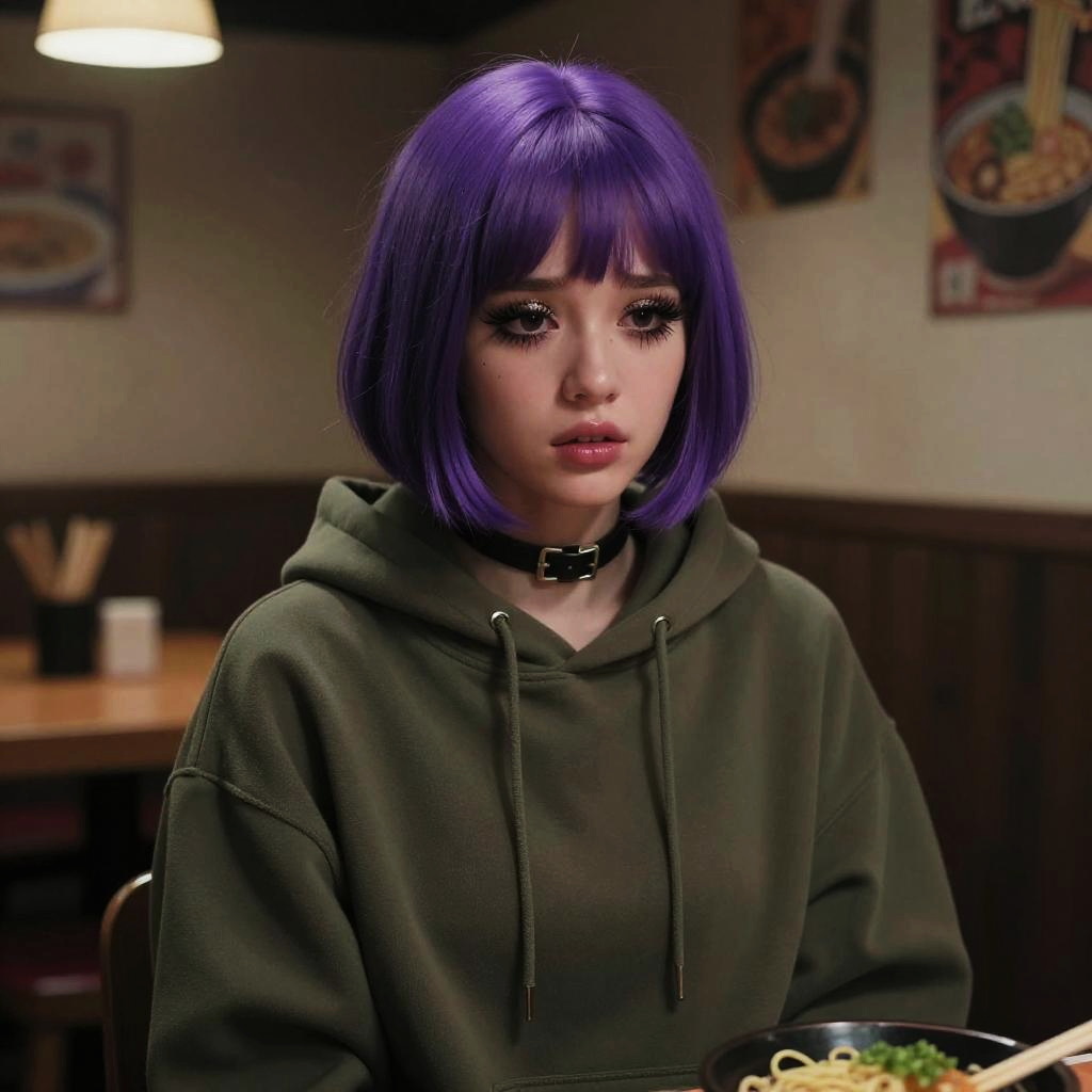 Raw photo, a cute afraid girl, purple stacked bob, 20 years old, curl mascara, glitter eyeliner, buff, choker, realistic skin texture, oversize hoodie, (Army Green:0.8), hardcore, cold lighting, morbid atmosphere, instagram style, fashion (ramen shop:1.1), (sfw:0.9), highly detailed photography, (muted colors, cinematic, dim colors, soothing tones:1.2), vibrant, insanely detailed, hyperdetailed, (dark shot:1.2), (vsco:0.3)