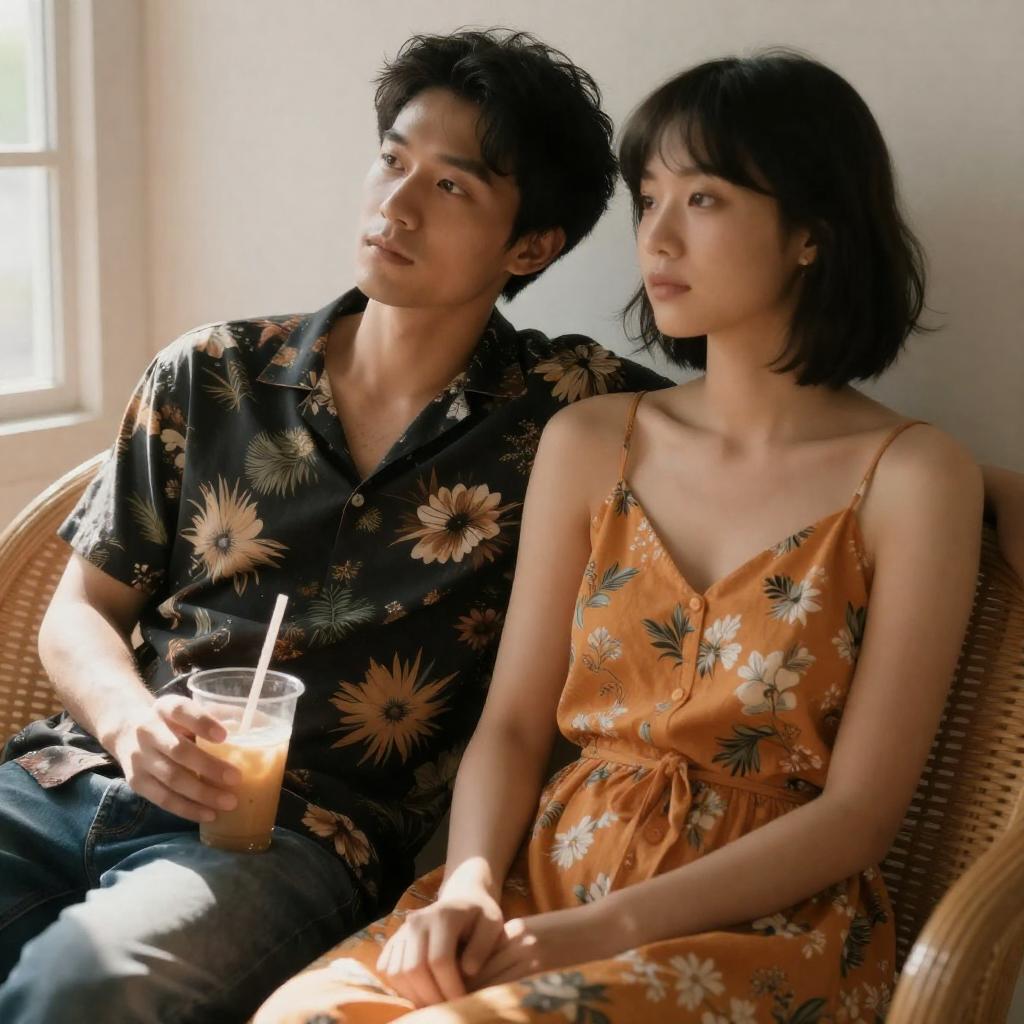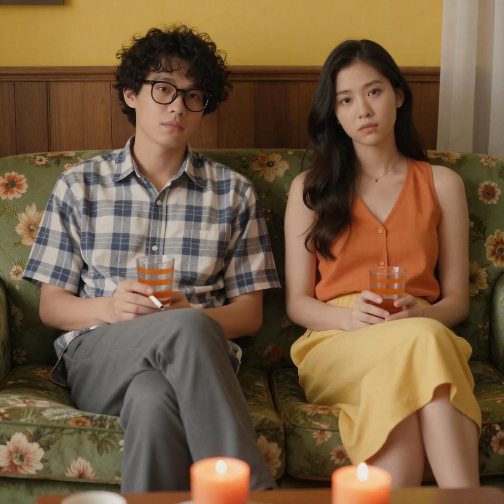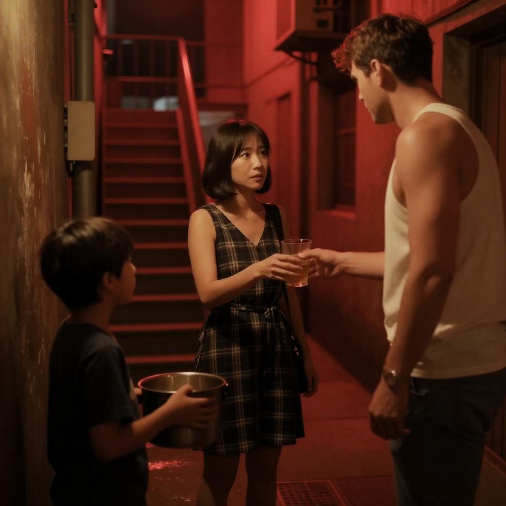 Photograph of a dimly lit, red-hued alleyway at night. An Asian woman with short black hair, wearing a black plaid dress, stands centered, receiving a drink from a white man with short brown hair, in a white tank top. A child with short hair, wearing a dark shirt, stands to the left, holding a pot. Warm, orange-red lighting casts dramatic shadows, with a staircase and industrial elements in the background.