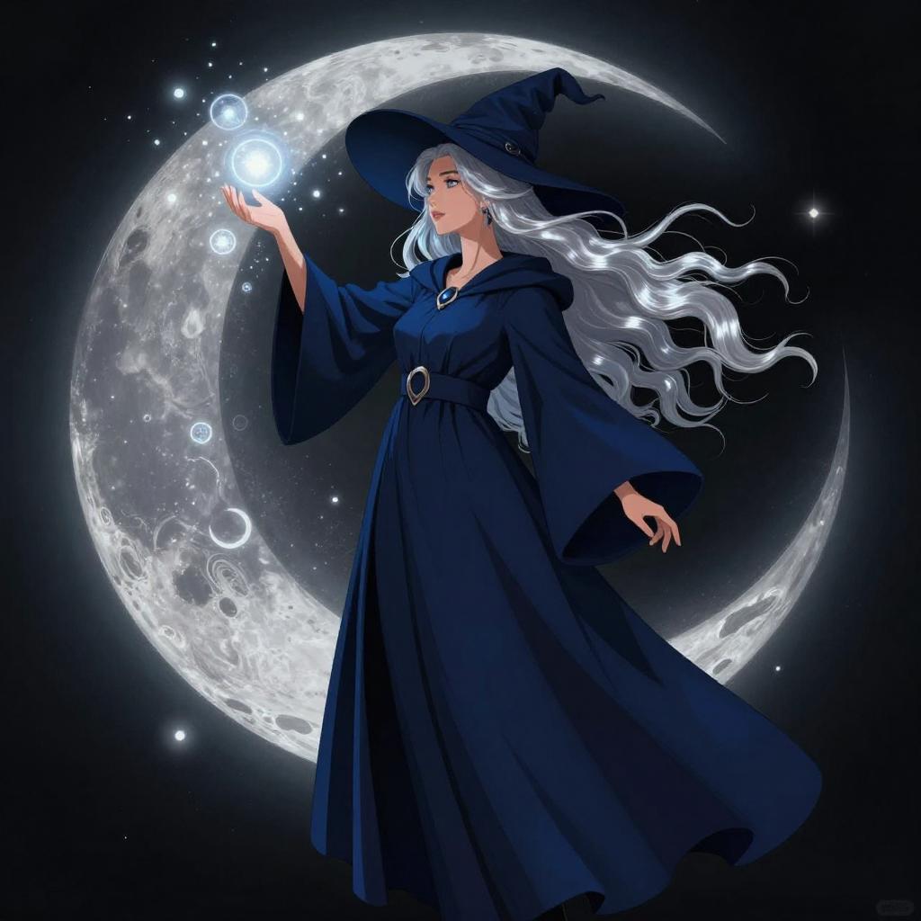 Digital anime-style illustration of a silver-haired witch in a dark blue robe and hat, casting a glowing spell against a luminous crescent moon in a