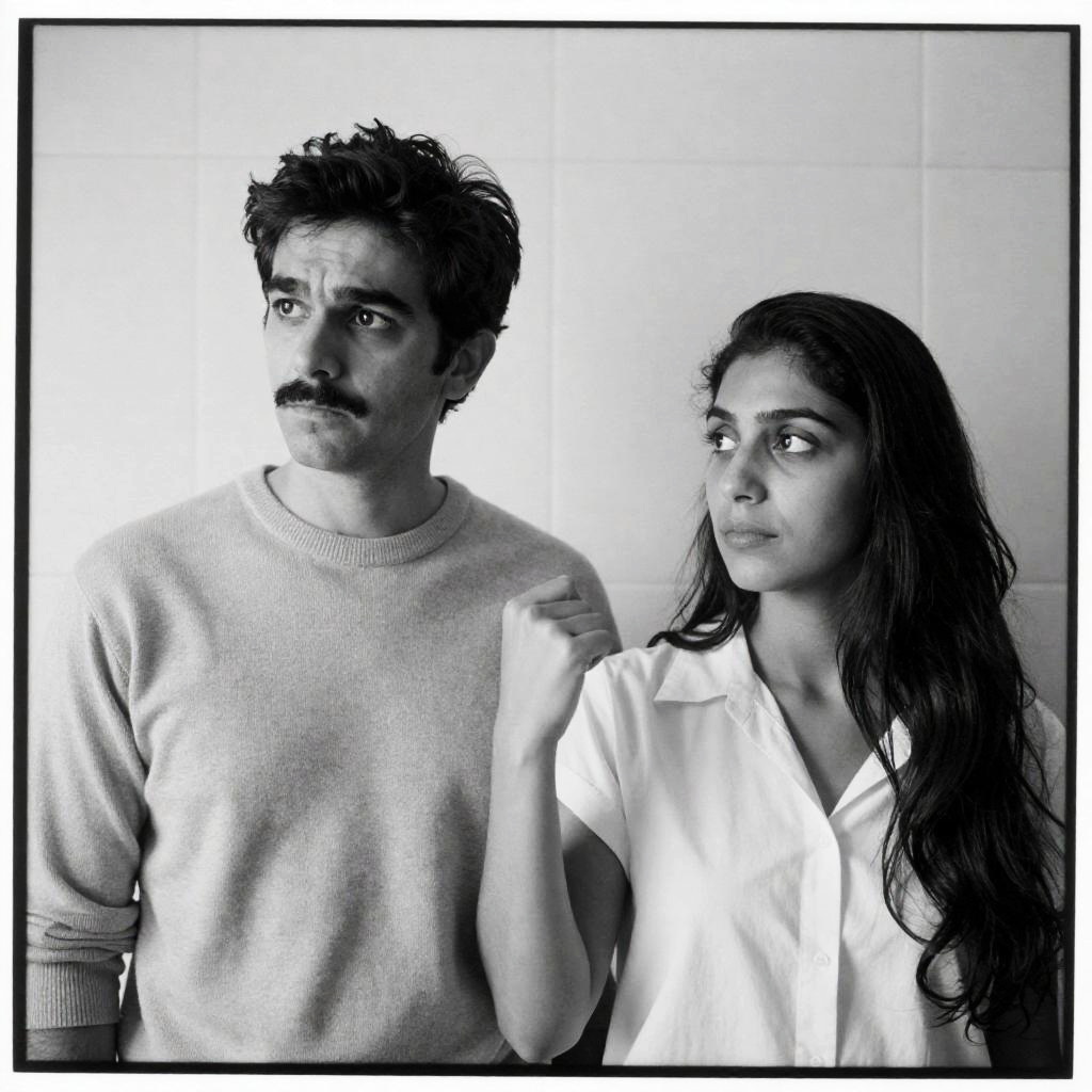 Black and white photograph of two people. Man with dark hair, mustache, light sweater, gripping woman's arm. Woman with long dark hair, white shirt, looking to the side. White padded wall background. Monochrome poster on left. Man's intense expression, woman's neutral expression. Both standing.