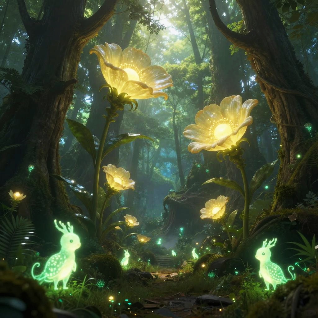 A digital fantasy artwork depicts a mystical forest bathed in ethereal light. Tall, glowing yellow flowers with luminescent petals stand prominently in the center, their light casting a soft glow. Surrounding the flowers are small, green, fairy-like creatures with glowing antlers and tails. Tiny fireflies dot the forest floor, adding to the enchanting atmosphere. The background features towering trees with dense foliage, creating a sense of depth and mystery. Light filters through the canopy, illuminating the scene with a magical, otherworldly ambiance.
