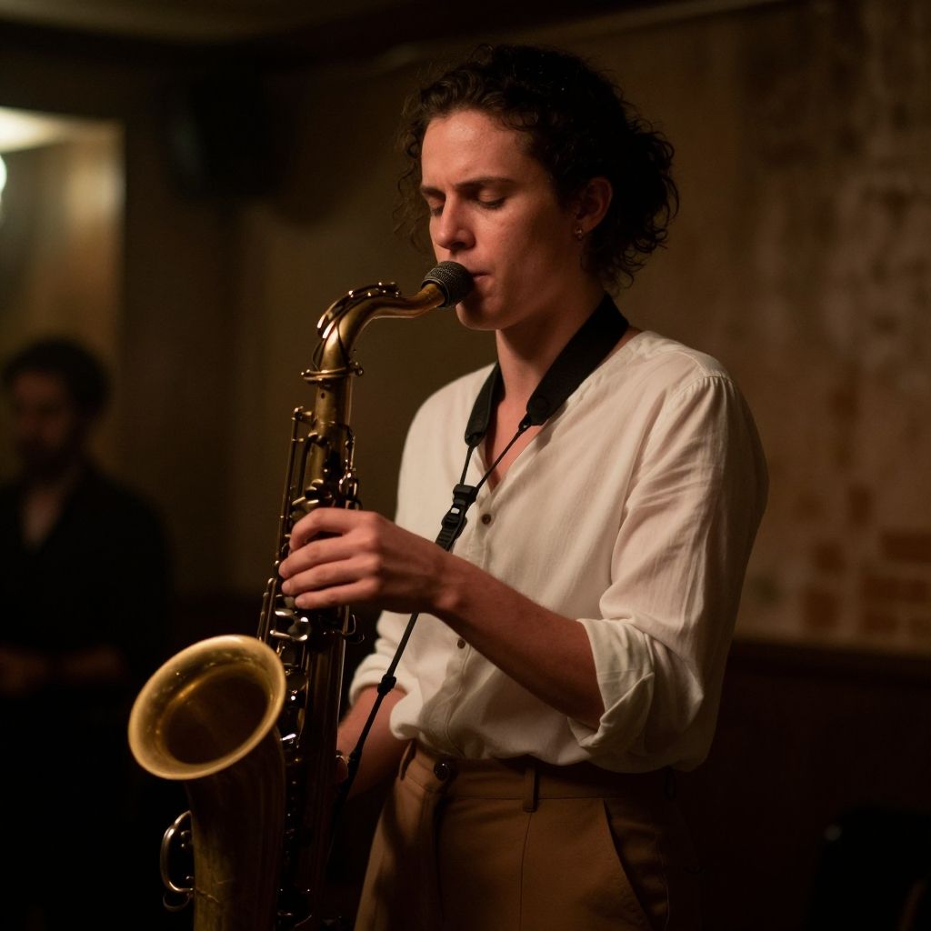 DEN_maia_serena, (playing (jazz:1.2) in a seedy jazz Hall wearing a (shirt and trousers:1.3), atmospherics, cinematic, scene, (jazz:1.2), jazz musician:1.2), bokeh, f1.4, 40mm, photorealistic, raw, 8k, textured skin, skin pores, epiCRealism