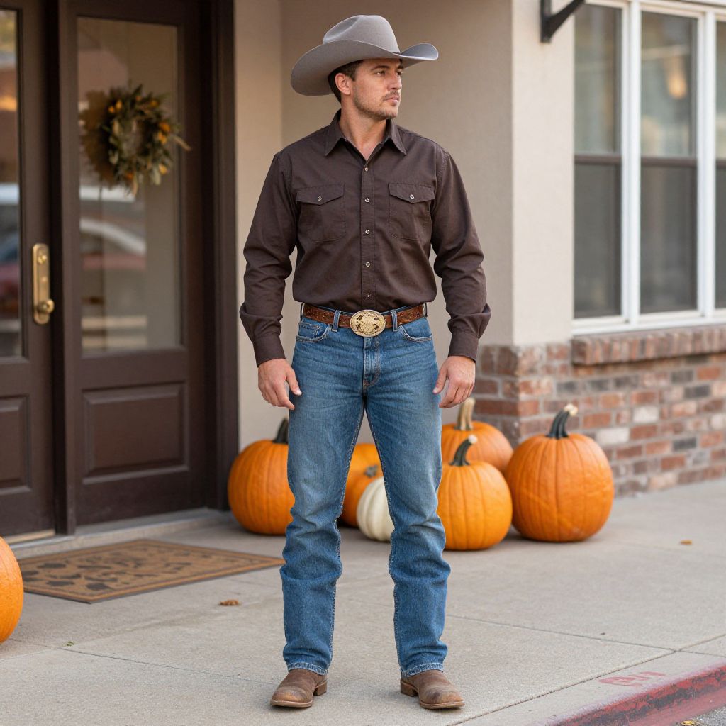"Western Wear Shirt, man in cowboy hat standing in front of a door"