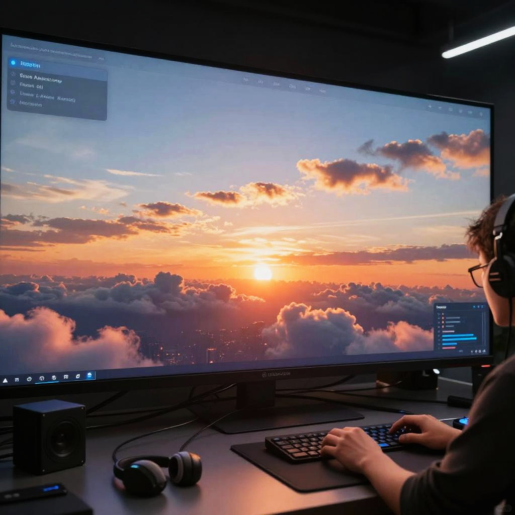 Skybox maker creating a vast digital environment with seamless panoramic skies, vibrant sunsets, and dynamic clouds, showcasing futuristic interface elements and creative tools, vibrant colors, sharp details, ultra-realistic style.