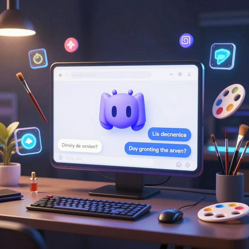 Discord AI image generator in action with a sleek chatbot avatar surrounded by floating digital paintbrushes and palettes, futuristic UI elements, glowing icons, high-tech ambiance, generating colorful surreal artwork in a virtual creative studio with sci-fi lighting.