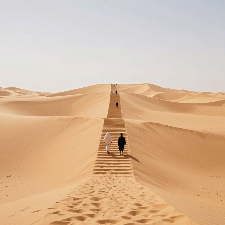 Staircase ascends through endless sand dunes under a vast desert sky, where figures in flowing robes walk toward a distant horizon, creating an illusion of infinite ascent.