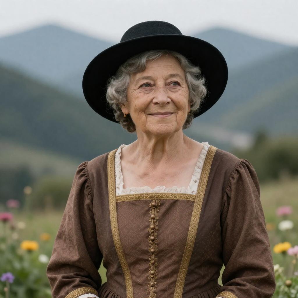 An elderly woman with white hair, dressed in a white bonnet and black vest over a white blouse, sits at a wooden desk in a rustic cabin. She reads a pink letter by the warm glow of a single lit candle. The desk is cluttered with papers and books, with a window showcasing a blue-tinted glass pane in the background.