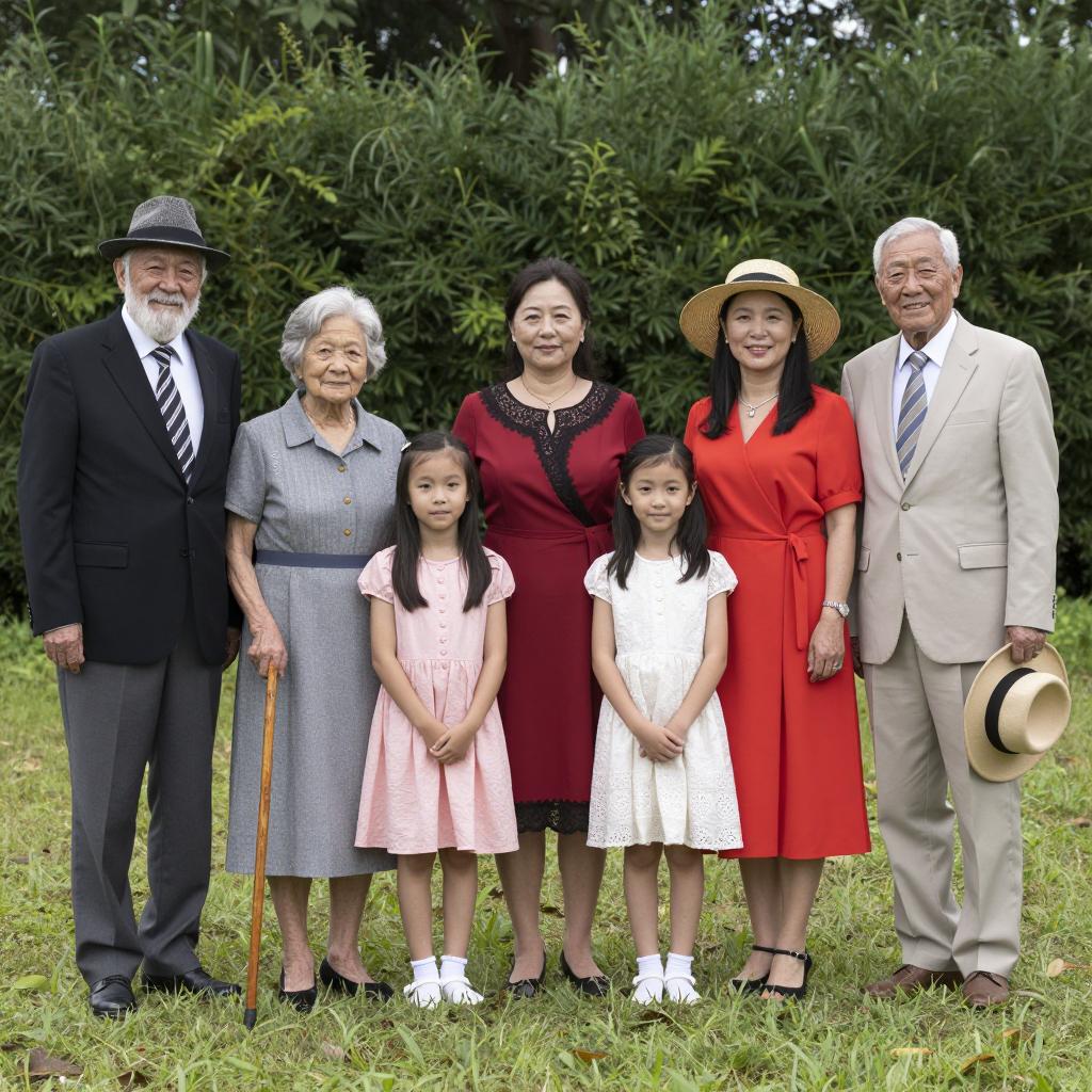 Group photograph of seven people standing on grass. Elderly man with white beard in black suit and hat, elderly woman in gray dress, woman in red dress with black lace, two young girls in pink dresses, woman in red dress with straw hat, elderly man in beige suit. Green hedge and trees in background. Everyone standing in a line, smiling. Woman in gray dress holding wooden cane. Elderly man in beige suit holding hat.