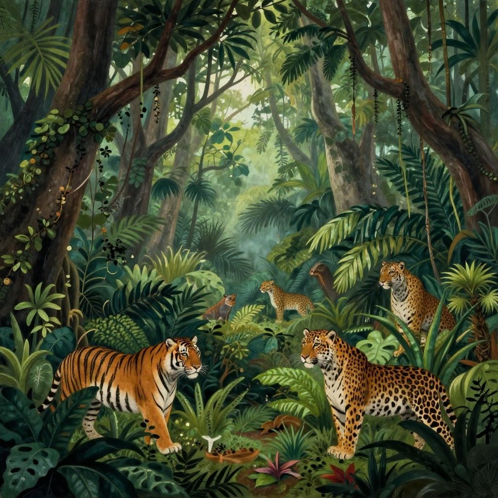 Artwork inspired by Henri Rousseau featuring a lush, enchanted jungle scene filled with dense green foliage, misty trees, and various exotic animals including tigers, a leopard, and other jungle creatures. The composition uses deep greens and earthy browns, creating a magical and dreamlike atmosphere.