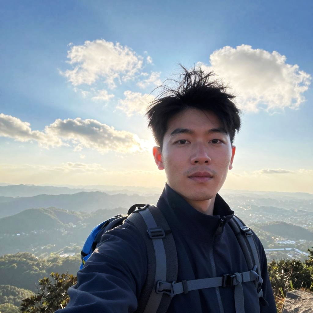 Photograph of an Asian man with short black hair and goatee, wearing a gray t-shirt, black backpack, and sunglasses, standing on a sunny