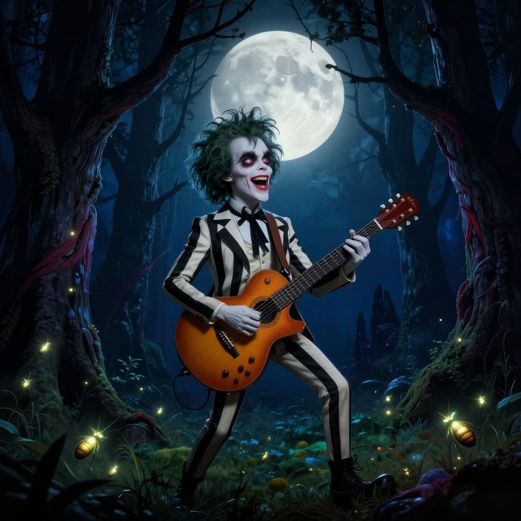 Beetlejuice playing guitar under a full moon in a dark forest, glowing insects around, twisted trees, vibrant contrasting colors, whimsical and creepy blend, fantasy art style