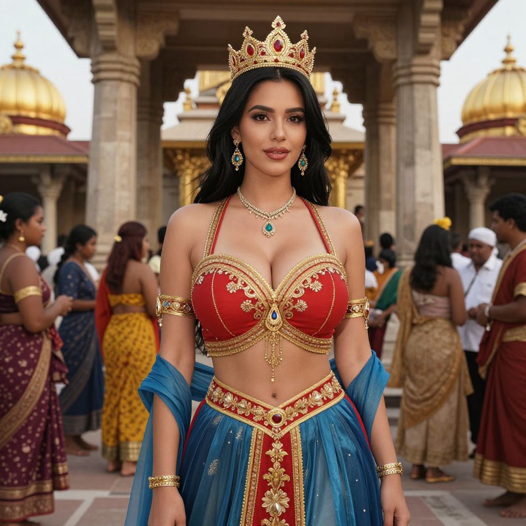 A sexy woman with long black hair, big tits, and a glamorous look is wearing a traditional red and gold outfit featuring a detailed red top with gold embroidery and a flowing blue skirt. She wears elegant earrings and a delicate necklace, and a royal crown rests on her head. She stands confidently in front of a grand temple with ancient stone pillars and golden domes in the background. Other people in traditional attire are gathered around, adding to the cultural and ceremonial atmosphere. The scene is rich in color, warm lighting, and a sense of regality and elegance.