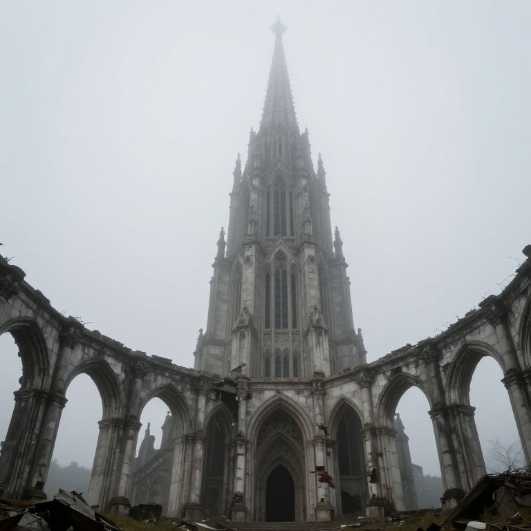 Amidst the fog-shrouded echoes of forgotten ambition, the towering spire stands as a haunting testament to humanity's relentless pursuit of transcendence, while the crumbling arches whisper tales of decay and the inexorable march of time.