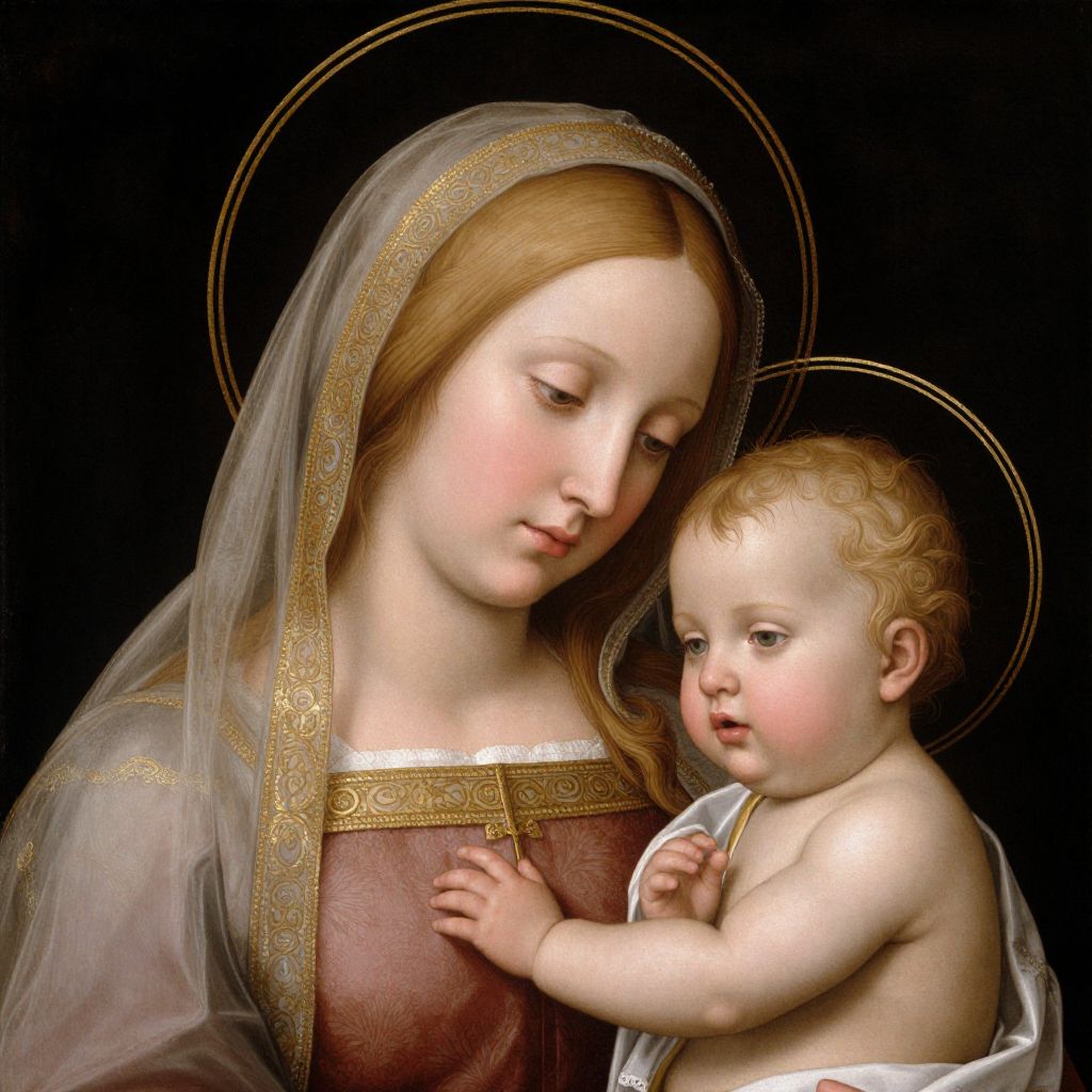 Delicate portrait of Mary and baby Jesus in early Renaissance style. The image shows a light-skinned woman with flowing blonde hair, her face surrounded by gossamer veils and an elaborate golden halo, gazing downward.
