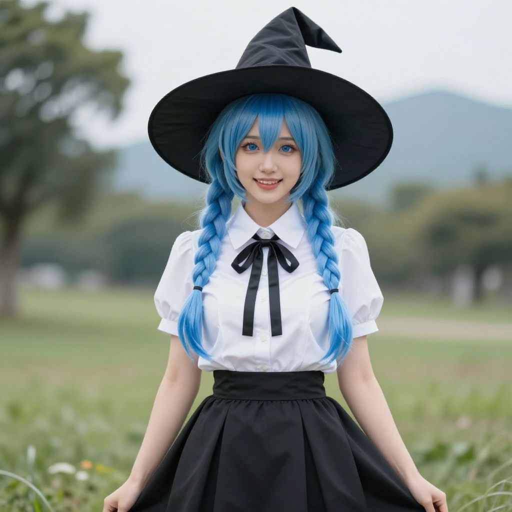 Digital anime-style illustration of a blue-haired witch with a black hat, white blouse, black skirt, and mountain valley background. She holds a broom
