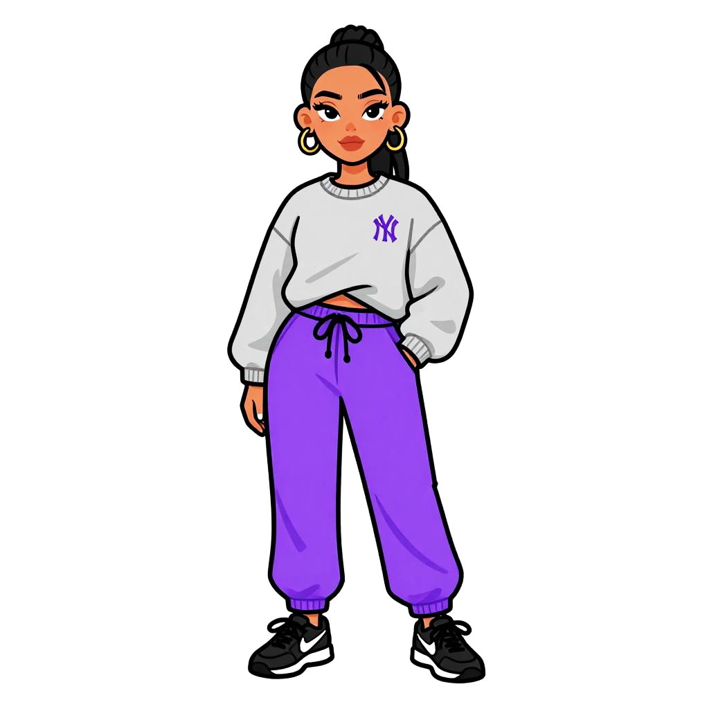 Woman with pretty face and pretty hair. Woman, sporty casual, grey fleece sweatshirt with crew neck and embroidered logo, matching sweatpants with drawstring waist, cuffed hems, black sneakers with white sole, hoop earrings, cornrow hairstyle, white studio background. --sref 1461
