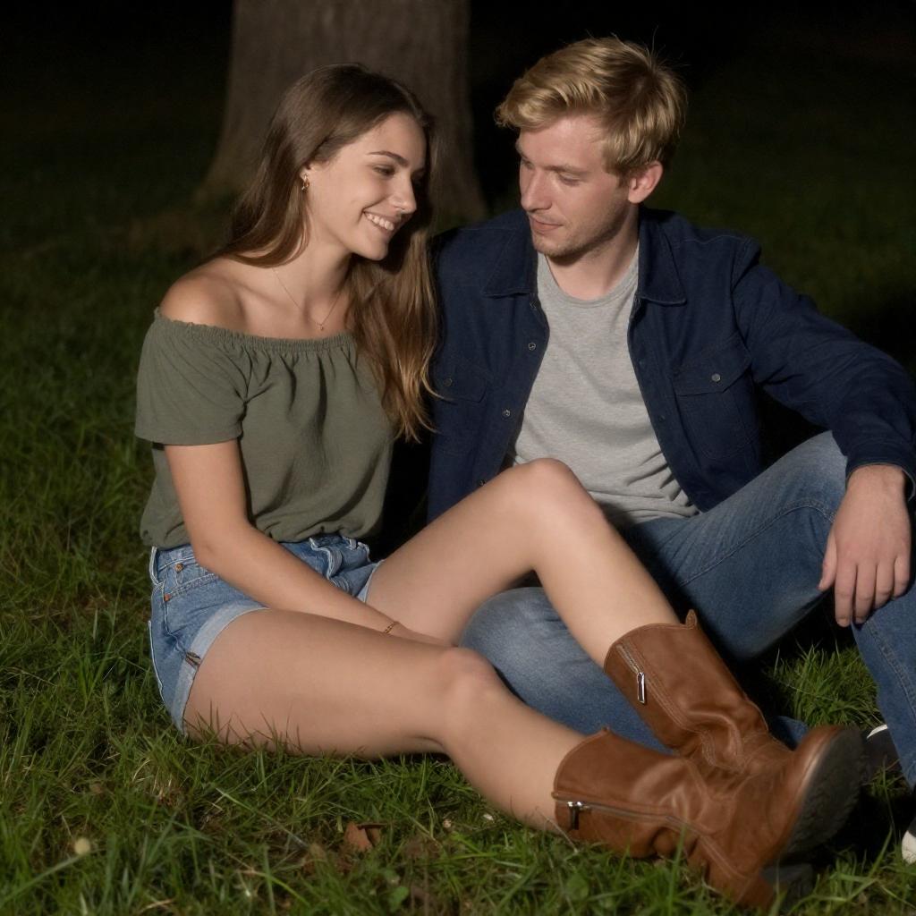 A young Caucasian couple sitting cross-legged on green grass at night. The woman has long brown hair and wears a green off-shoulder shirt, denim shorts, and brown boots. She is smiling and looking down. The man has short blonde hair and is dressed in a blue jacket, gray shirt, and jeans. He is looking attentively at the woman's leg which rests on his lap. The background features a tree and dim lighting.