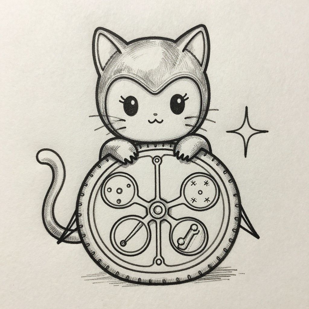 Cute black-and-white digital drawing of a chibi cat with a mechanical gear helmet, holding it with paws, tail curled.