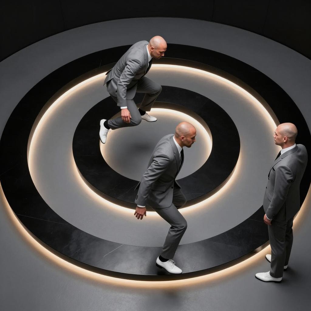 Two bald men in gray suits with white shoes jump into a circular black and gray spiral with illuminated edges. One man is larger, the other smaller. A third man in a gray suit stands to the right.