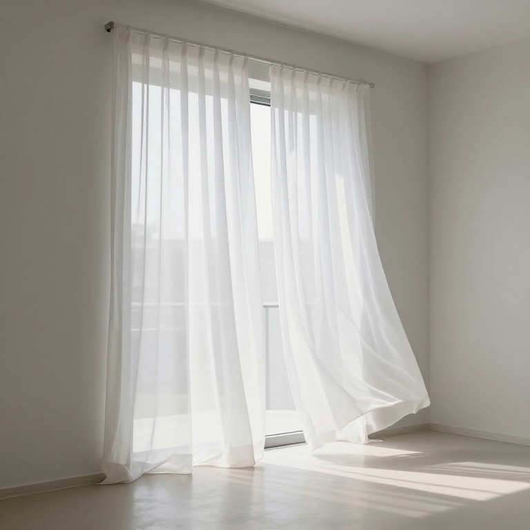 Photograph of a bright, empty room with white sheer curtains covering a large window, letting in soft natural light.