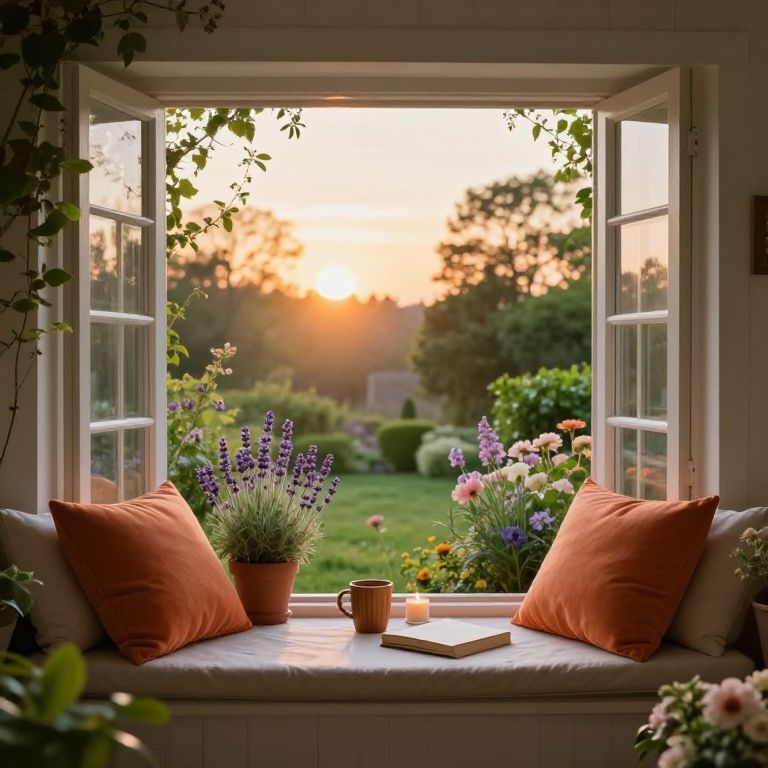 Photograph of a cozy window seat at sunset, framed by open white windows with green leafy vines. The seat is adorned with two orange cushions and holds two potted lavender plants, a pink and purple flower arrangement, and a small orange mug. A closed book is placed beside the mug. The background reveals a lush, green garden with blooming flowers, trees, and a sun setting in the distance, casting a warm, golden glow. The scene exudes a peaceful, inviting atmosphere.