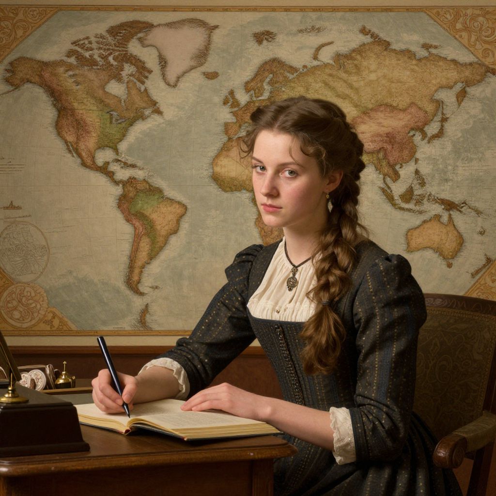 A classical Russian-style digital artwork by KORZUKHIN Alex, featuring a young woman in period attire writing on a desk against a backdrop of a detailed world map, rendered with vintage lighting and high-definition detail reminiscent of classic Russian paintings.