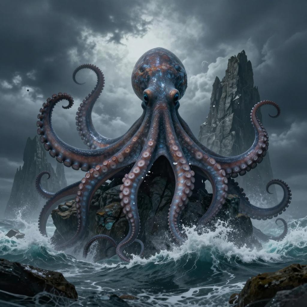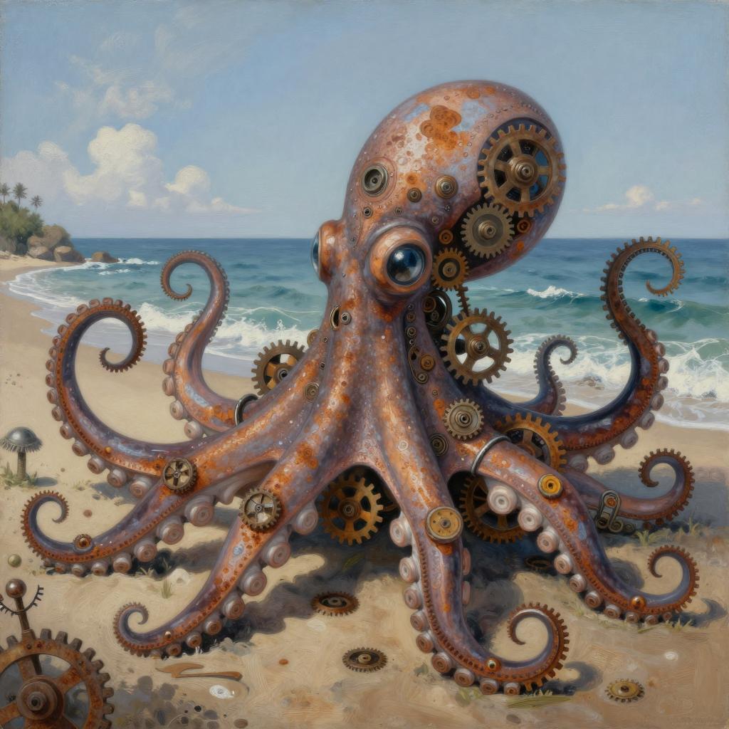 Surreal painting of a mechanical octopus composed of intricate rusted gears and steampunk elements, set against a coastal landscape with sandy shores and ocean waves. The artwork features detailed gear mechanisms forming the body and tentacles, blending organic octopus shapes with industrial machinery aesthetics.