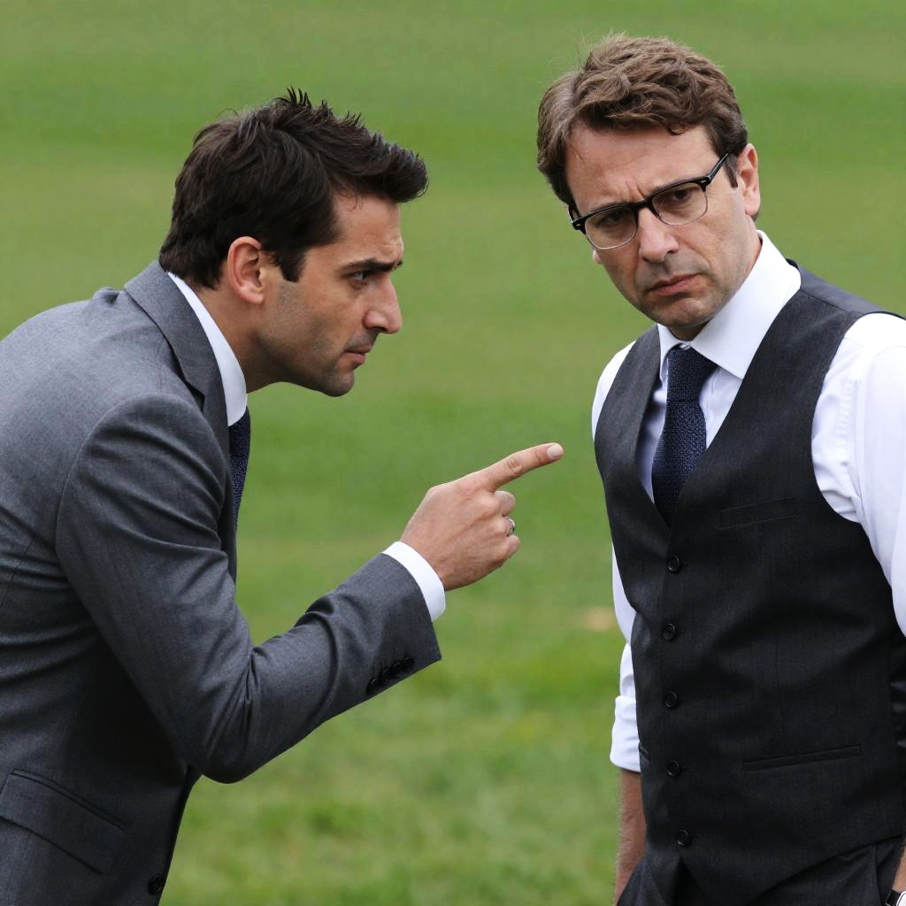 Photograph of two men in a close-up shot. The man on the left has dark hair, wears a light blue shirt, and points a black cane forward with a serious expression. The man on the right has short blonde hair, wears a black shirt, and looks intently at the camera. They stand closely together against a blurred blue and white background.