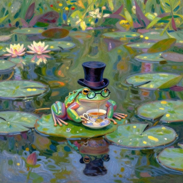 Visualize an enchanting, impressionistic garden setting, reminiscent of Monet's serene Water Lilies series with a touch of surreal whimsy. A delicate iridescent frog rests on lily pads, wearing an exquisite top hat and monocle as it sips tea from a dainty china cup in the peaceful pond below. From above, witness how the dancing sunlight filters through the verdant canopy, creating a mesmerizing display of colors that dance upon the water's surface. This harmonious blend of enchantment and mischief beckons viewers to imagine the delightful escapades occurring within this captivating dreamscape.