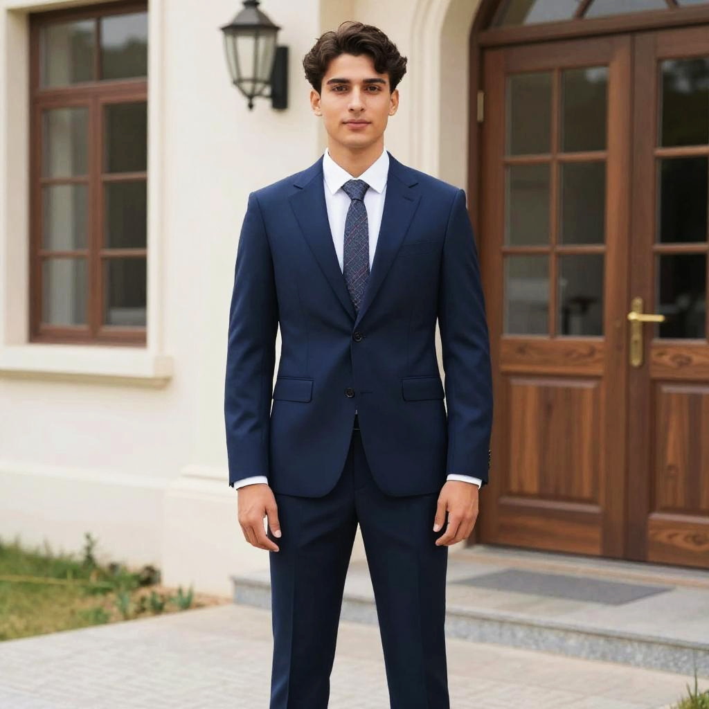 Young man with dark curly hair wearing a tailored blue suit with a white shirt and patterned tie, standing confidently in front of a building with wooden doors and windows. The setting appears to be an outdoor urban or residential area with a paved walkway and some greenery.