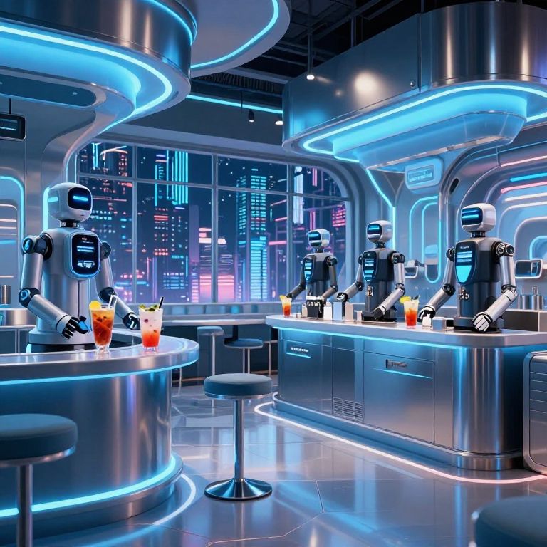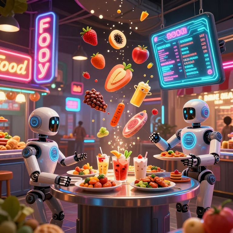 Foody imaginative futuristic food market with neon signs, robots serving exotic meals, holographic menus, diverse colorful ingredients floating in midair, blending cyberpunk and vibrant street culture aesthetics with dynamic lighting.