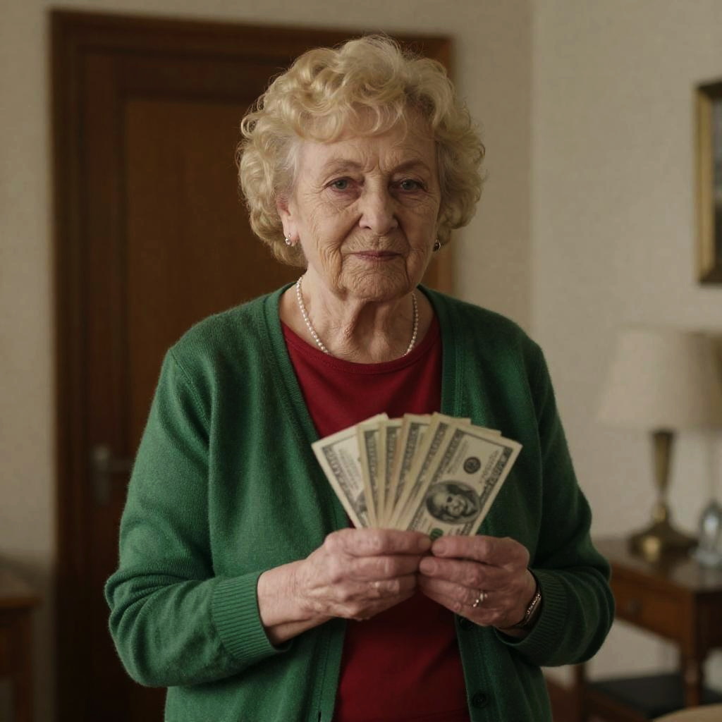 Photograph of an elderly woman with short, curly blonde hair, wearing a green cardigan over a red shirt, holding a stack of money in her right hand. She stands in a dimly lit room with a wooden door in the background. Her expression is calm and slightly smiling. A lamp is on a table to the right.