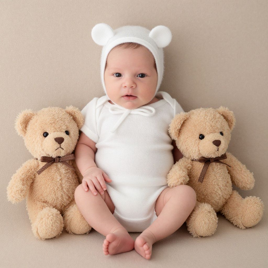 Photograph of a fair-skinned, blue-eyed baby with soft features, wearing a white, short-sleeved onesie and a white bear hat with small ears. The baby sits between two beige, plush teddy bears, each with a brown ribbon around the neck. The baby's legs are slightly apart, and their small hands rest on their thighs. The background is a plain, light beige wall, creating a soft, neutral setting that highlights the baby and teddy bears. The teddy bears are positioned symmetrically, one on each side of the baby. The image has a warm, gentle light.