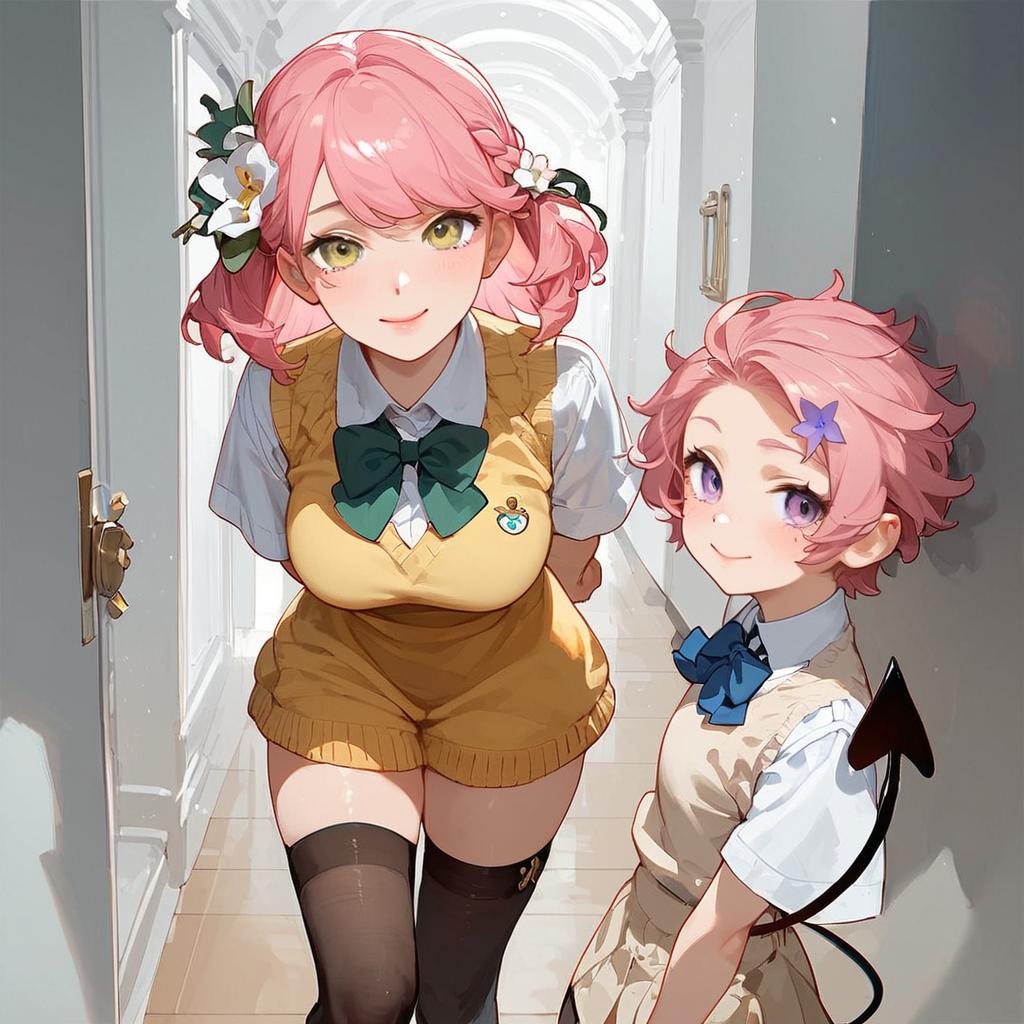 Digital illustration of two anime-style girls with pink hair standing in a hallway. The girl on the left has braided pink hair adorned with white flowers, wearing a yellow sweater vest over a white short-sleeve shirt, green bowtie, and black thigh-high stockings. The girl on the right has short pink hair with a small purple flower, a beige sweater vest over a white shirt, a blue bowtie, and a demon tail. Both girls are smiling and looking at the viewer.